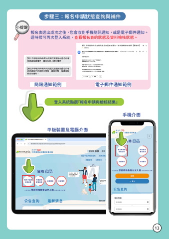 13%u6b65%u9a5f%u4e09%uff1a%u5831%u540d%u7533%u8acb%u72c0%u614b%u67e5%u8a62%u8207%u88dc%u4ef6%u767b%u5165%u7cfb%u7d71%u9ede%u9078%u300e%u5831%u540d%u7533%u8acb%u8207%u6aa2%u6838%u7d50%u679c%u300f%u5e73%u677f%u88dd%u7f6e%u53ca%u96fb%u8166%u4ecb%u9762OOO %u5bb6%u9577%u624b%u6a5f%u4ecb%u9762%u5831%u540d%u8868%u9001%u51fa%u6210%u529f%u4e4b%u5f8c%uff0c%u60a8%u6703%u6536%u5230%u624b%u6a5f%u7c21%u8a0a%u901a%u77e5%uff0c%u6216%u662f%u96fb%u5b50%u90f5%u4ef6%u901a%u77e5%u3002%u9019%u6642%u5019%u53ef%u518d%u6b21%u767b%u5165%u7cfb%u7d71%uff0c%u67e5%u770b%u5831%u540d%u8868%u7684%u72c0%u614b%u53ca%u8cc7%u6599%u6aa2%u6838%u72c0%u614b%u3002%u5c0f%u63d0%u9192%u7c21%u8a0a%u901a%u77e5%u7bc4%u4f8b %u96fb%u5b50%u90f5%u4ef6%u901a%u77e5%u7bc4%u4f8b